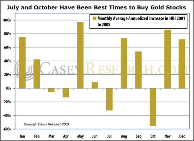 Since 2001, July and October have been the weakest months for gold stocks, as measured by the AMEX Gold Bugs Index, and the best times to buy.